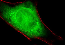 Immunofluorescence: HeLa cells stained with ARG55764 anti-PSMC1 antibody (green) at 1:25 dilution. Cytoplasmic actin was counterstained with Alexa Fluor® 555 conjugated with Phalloidin (red).