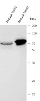 Western blot: Mouse testis and Mouse heart stained with ARG44565 anti-PTCD1 antibody at 0.5 μg/mL dilution.