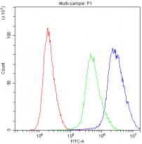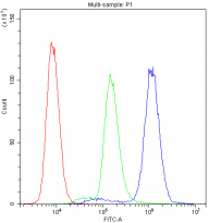 Flow Cytometry: U937 cells were blocked with 10% normal goat serum and then stained with ARG59224 anti-PTP4A2 antibody (blue) at 1 ug/10^6 cells for 30 min at 20°C, followed by DyLight®488 labelled secondary antibody. Isotype control antibody (green) was rabbit IgG (1 ug/10^6 cells) used under the same conditions. Unlabelled sample (red) was also used as a control.