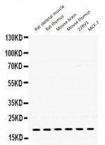Western blot: 50 µg of samples under reducing conditions. Rat skeletal muscle, Rat thymus, Mouse brain, Mouse thymus, 22RV1 and MCF-7 whole cell lysates stained with ARG59224 anti-PTP4A2 antibody at 0.5 µg/ml, overnight at 4°C.