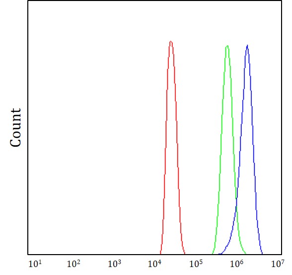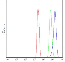 Flow Cytometry: 293T cells stained with ARG44005 anti-PYCR1 antibody (blue) at 1 μg/1x10^6 cells dilution.