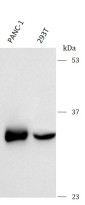 Western blot: PANC-1 and 293T stained with ARG44005 anti-PYCR1 antibody at 0.5 μg/mL dilution.