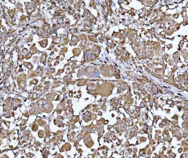 Immunohistochemistry: Human lung cancer carcinoma stained with ARG44005 anti-PYCR1 antibody at 2 μg/ml dilution.