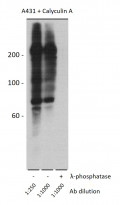 Western blot: A431 cells treated with calyculin A (100 nM) for 30 min (lane 1 and 2) then treated with lambda phosphatase (lane 3). The blot was stained with ARG23897 anti-Phosphoserine / threonine antibody [M380A + M380B] at 1:250 (lane 1) or 1:1000 (lanes 2 and 3).
