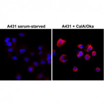 Immunofluorescence: Serum-starved A431 cells nontreated or treated with Calyculin A/Okadaic Acid, stained with ARG57186 anti-Phosphothreonine antibody [RM102] at 1:500 dilution (followed by PE-conjugated secondary antibody, red) and DAPI (blue).