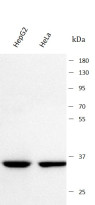 Western blot: HepG2 and HeLa stained with ARG44472 anti-Pirin antibody at 0.5 μg/mL dilution.
