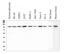 Western blot: 50 µg of samples under reducing conditions. Human placenta, HL-60, 22RV1, 293T, PANC-1, SGC-7901, Caco-2, PC-3, Rat brain and Mouse brain lysates stained with ARG40848 anti-Plasminogen antibody at 0.5 µg/ml, overnight at 4°C.