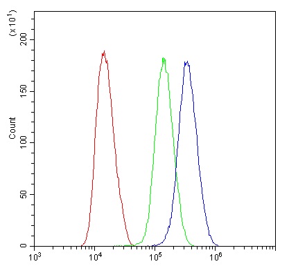 Flow Cytometry: U251 cells were blocked with 10% normal goat serum and then stained with ARG40848 anti-Plasminogen antibody (blue) at 1 µg/10^6 cells for 30 min at 20°C, followed by incubation with DyLight®488 labelled secondary antibody. Isotype control antibody (green) was rabbit IgG (1 µg/10^6 cells) used under the same conditions. Unlabelled sample (red) was also used as a control.