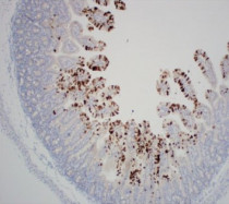 Immmunohistochemistry: Staining of enterocytes (brown color) in an intestinal tissue from a CDCD piglet experimentally infected with ARG70023 anti-Porcine Rotavirus VP6 (Serogroup C) antibody [11H3]. The intestinal tissue also shows villous atrophy.