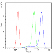 Flow Cytometry: A431 cells were blocked with 10% normal goat serum and stained with ARG40835 anti-Profilin 2 antibody (blue) at 1 µg/10^6 cells for 30 min at 20°C, followed by incubation with DyLight®488 labelled secondary antibody. Isotype control antibody (green) was Rabbit IgG (1 µg/10^6 cells) used under the same conditions. Unlabelled sample (red) was also used as a control.
