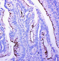 Immunohistochemistry: Paraffin-embedded Human intestinal cancer tissue. Antigen Retrieval: Heat mediation was performed in Citrate buffer (pH 6.0, epitope retrieval solution) for 20 min. The tissue section was blocked with 10% goat serum. The tissue section was then stained with ARG40835 anti-Profilin 2 antibody at 1 µg/ml, overnight at 4°C.