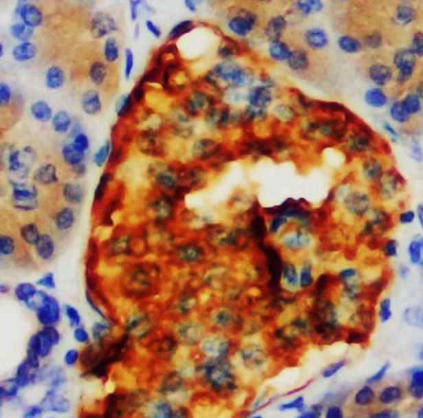 Immunohistochemistry: Human pancreas stained with ARG42540 anti-RAB3A antibody at 1:750 dilution.