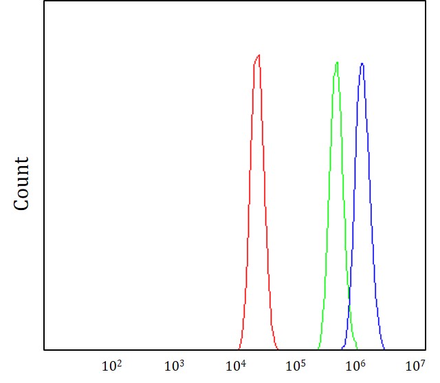 Flow Cytometry: MCF-7 stained with ARG44450 anti-RAB3IP antibody at 1 μg/10^6 cells dilution.