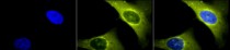 Immunocytochemistry: 2% Formaldehyde (20 min at RT) fixed Heat Shocked HeLa cells stained with ARG22296 anti-RAB4 antibody (yellow) at 1:150 dilution (12 hours at 4°C). Counterstain: DAPI (blue) nuclear stain at 1:40000 for 120 min at RT. Magnification: 100x. Left: DAPI (blue) nuclear stain, Middle: Primary antibody, Right: Composite.