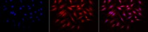 Immunocytochemistry: 2% Formaldehyde (20 min at RT) fixed Heat Shocked HeLa cells stained with ARG22296 anti-RAB4 antibody (red) at 1:150 dilution (12 hours at 4°C). Counterstain: DAPI (blue) nuclear stain at 1:40000 for 120 min at RT. Magnification: 20x. Left: DAPI (blue) nuclear stain, Middle: Primary antibody, Right: Composite.