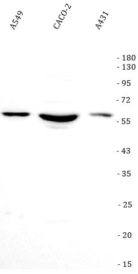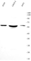 Western blot: A549, CACO-2, and A431 stained with ARG45206 anti-RBM47 antibody at 0.5 μg/ml dilution.