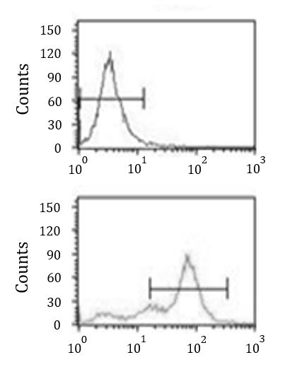 Flow Cytometry: K562 cells stained with ARG41294 anti-RFC2 antibody (bottom histogram) or without primary antibody as control (top histogram), followed by incubation with FITC labelled secondary antibody.