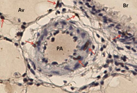 Immunohistochemistry: Paraffin-embedded Rat lung tissue stained with ARG41294 anti-RFC2 antibody at 1:200 dilution and counter stained with Hematoxylin. Positive cells identified with arrows. Av-Alveoli, Br-Bronchus, Pa-Pulmonary Artery.