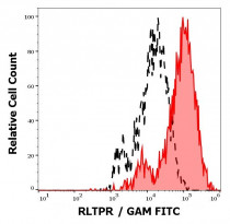 Flow Cytometry: Separation of RLTPR transfected cells stained with ARG42414 anti-RLTPR antibody [EM-53] at 9 µg/ml dilution (red-filled) from RLTPR transfected cells stained with ARG65323 Mouse IgG1 Kappa Isotype Control antibody [MOPC-21] at 9 µg/ml dilution (black-dashed). Secondary antibody: FITC-conjugated Goat anti-Mouse antibody.