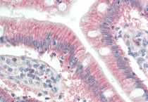Immunohistochemistry: Paraffin-embedded Human small intestine tissue. Antigen Retrieval: Steam tissue section in Citrate buffer (pH 6.0). The tissue section was stained with ARG63595 anti-RNF39 / LIRF antibody at 10 µg/ml dilution followed by AP-staining.