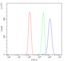 Flow Cytometry: U20S cells were blocked with 10% normal goat serum and stained with ARG40701 anti-RPL19 antibody (blue) at 1 µg/10^6 cells for 30 min at 20°C, followed by incubation with DyLight®488 labelled secondary antibody. Isotype control antibody (green) was rabbit IgG (1 µg/10^6 cells) used under the same conditions. Unlabelled sample (red) was also used as a control.