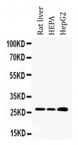 Western blot: Rat liver, HEPA and HepG2 whole cell lysates stained with ARG40701 anti-RPL19 antibody at 0.5 µg/ml.