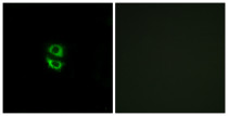 Immunofluorescence: A549 cells stained with ARG66597 anti-RPL39 antibody. The picture on the right is blocked with the synthetic peptide.