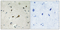 Immunohistochemistry: Paraffin-embedded Human brain stained with ARG66597 anti-RPL39 antibody at 1:100 (4°C, overnight). Antigen Retrieval: High-pressure and temperature Tris-EDTA buffer (pH 8.0). The picture on the right is blocked with the synthetic peptide.