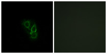 Immunofluorescence: A549 cells stained with ARG66689 anti-RRAD antibody (green). The picture on the right is blocked with the synthetic peptide.