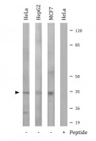 Western blot: HeLa, HepG2 and MCF7 cell lysates stained with ARG66689 anti-RRAD antibody. The lane on the right is blocked with the synthetic peptide.
