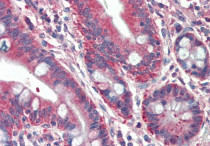 Immunohistochemistry: Paraffin-embedded Human small intestine tissue stained with ARG41230 anti-RUFY1 antibody at 5 µg/ml dilution. Antigen Retrieval: Steam tissue section in Citrate buffer (pH 6.0).