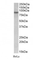 Western blot: 35 µg of HeLa cell lysate (in RIPA buffer) stained with ARG41230 anti-RUFY1 antibody at 0.05 µg/ml dilution and incubated at RT for 1 hour.