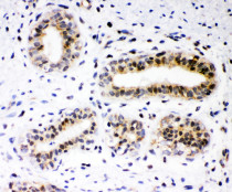 Immunohistochemistry: Paraffin-embedded Human mammary cancer tissue. Antigen Retrieval: Heat mediation was performed in Citrate buffer (pH 6.0, epitope retrieval solution) for 20 min. The tissue section was blocked with 10% goat serum. The tissue section was then stained with ARG41229 anti-RUNX1 / AML1 antibody at 1 µg/ml dilution, overnight at 4°C.