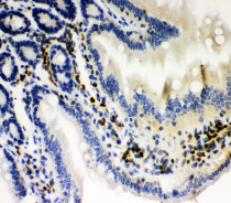 Immunohistochemistry: Paraffin-embedded Mouse intestine tissue. Antigen Retrieval: Heat mediation was performed in Citrate buffer (pH 6.0, epitope retrieval solution) for 20 min. The tissue section was blocked with 10% goat serum. The tissue section was then stained with ARG41229 anti-RUNX1 / AML1 antibody at 1 µg/ml dilution, overnight at 4°C.