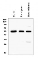 Western blot: 50 µg of samples under reducing conditions. HL-60, Rat thymus and Mouse thymus lysates stained with ARG41229 anti-RUNX1 / AML1 antibody at 0.5 µg/ml, overnight at 4°C.