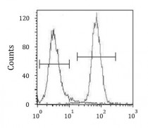 Flow Cytometry: NCI-H460 cells stained with ARG54882 anti-RUNX2 antibody (right histogram) or without primary antibody control (left histogram), followed by incubation with FITC labelled secondary antibody.