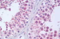 Immunohistochemistry: Paraffin-embedded Human testis tissue. Antigen Retrieval: Steam tissue section in Citrate buffer (pH 6.0). The tissue section was stained with ARG63351 anti-RanBP9 / RANBPM antibody at 10 µg/ml dilution followed by AP-staining.