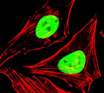 Immunofluorescence: HeLa cells stained with ARG42126 anti-SAP30BP antibody (green) at 1:25 dilution. Alexa Fluor® 555 Phalloidin (red) for cytoplasmic actin staining.