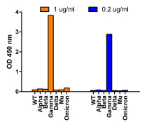 Direct ELISA: 100μl of SARS-CoV-2 spike S1 proteins WT, alpha variant (B.1.1.7), beta variant (B.1.351), gamma variant (P.1), delta variant (B.1.617.2), mu variant (B.1.621), and omicron variant (B.1.1.529) at a concentration of 1 μg/mL, incubated in a 96-well plate at 4 °C for overnight. The coated plate were incubated with 1 μg/mL or 0.2 μg/mL of ARG43732 anti-SARS-CoV-2 Spike P26S (Gamma Variant) antibody at RT for 1 hr. ARG43732 anti-SARS-CoV-2 Spike P26S (Gamma Variant) antibody detects Gamma Variant spike S1 protein only.