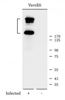 Western blot: SARS-CoV-2 infected (left) and uninfected (right) VeroE6 cells. 30 ug of cell lysates were stained with ARG42918 anti-SARS-CoV-2 Spike protein antibody at 1:5000 dilution.