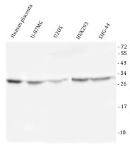 Western blot: Human placenta, U-87MG, U2OS, HEK293, SHG-44, K562, and HL-60 stained with ARG45158 anti-SCN4B antibody at 0.5 μg/ml dilution.