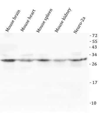 Western blot: Mouse brain, mouse heart, mouse spleen, mouse kidney, and mouse Neuro-2a stained with ARG45158 anti-SCN4B antibody at 0.5 μg/ml dilution.