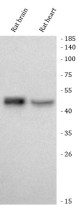 Western blot: Rat brain and rat heart stained with ARG45270 anti-SGCE antibody at 0.5 μg/ml dilution.