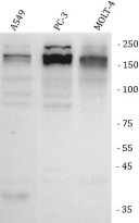 Western blot: A549, PC-3 and MOLT-4 stained with ARG45271 anti-SGO2 antibody at 0.5 μg/ml dilution.