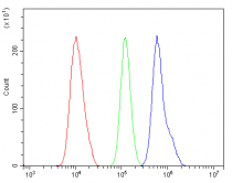 Flow Cytometry: U87 cells were blocked with 10% normal goat serum and then stained with ARG42931 anti-SLBP antibody (blue) at 1 µg/10^6 cells for 30 min at 20°C, followed by incubation with DyLight®488 labelled secondary antibody. Isotype control antibody (green) was Rabbit IgG (1 µg/10^6 cells) used under the same conditions. Unlabelled sample (red) was also used as a control.