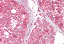 Immunohistochemistry: Paraffin-embedded Human testis tissue. Antigen Retrieval: Steam tissue section in Citrate buffer (pH 6.0). The tissue section was stained with ARG63626 anti-SLC16A7 / MCT2 antibody at 2.5 µg/ml dilution followed by AP-staining.