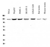 Western blot: 50 µg of samples under reducing conditions. HeLa, HepG2, PANC-1, SK-OV-3, COLO-320, Rat testis and Mouse testis lysates stained with ARG59433 anti-SMC6L1 antibody at 0.5 µg/ml, overnight at 4°C.