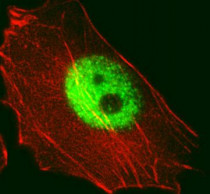 Immunofluorescence: A549 cells were fixed with 4% PFA (20 min), permeabilized with Triton X-100 (0.1%, 10 min), then stained with ARG55243 anti-SOX2 antibody (green) at 1:25 dilution, 1 hour at 37°C. Cytoplasmic actin was counterstained with Alexa Fluor® 555 (red) conjugated Phalloidin (7 units/ml, 1 hour at 37°C).