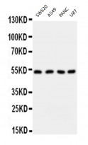 Western blot: 40 µg of SW620, A549, PANC and U87 whole cell lysates stained with ARG59270 anti-SPTLC1 antibody at 0.5 µg/ml dilution.
