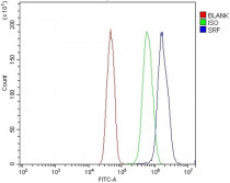 Flow Cytometry: U251 cells were blocked with 10% normal goat serum and then stained with ARG43746 anti-SRF antibody (blue) at 1 µg/10^6 cells for 30 min at 20°C, followed by incubation with DyLight®488 labelled secondary antibody. Isotype control antibody (green) was rabbit IgG (1 µg/10^6 cells) used under the same conditions. Unlabelled sample (red) was also used as a control.